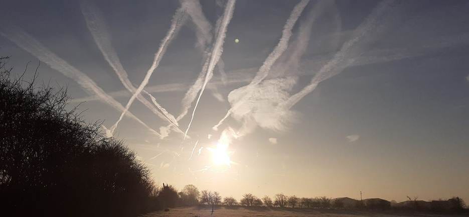 09:25 The briefly golden morning sky has gone. The murky white area (top right) was once the sun - now hidden behind a screen of thick, expanded spray. A dozen or more streams have been added, forming a sloppy matrix. This mist of toxins will not evaporate because it is not moisture-based. In fact it will gradually descend and enter the soil, the trees and plants, the water supply and the lungs of everything that breathes -including humans. [Read: Nanoplastic Contamination in Bird Lungs]
