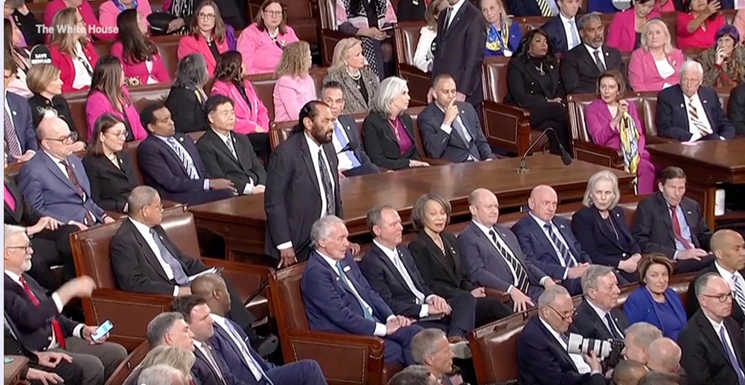 Let’s discuss the optics, shall we? Democrat congresswomen dressed in pink—almost as if auditioning for a Barbie reboot—sat there with stone faces, refusing to clap even when Trump promised to improve life for, you know, actual Americans. Others wore blue and yellow for Ukraine because nothing says “we care about our constituents” like transforming a domestic policy speech into a foreign aid fashion show. They brought guests—fired federal workers, Medicaid sob stories—as if parading human props could somehow erase the fact that Trump won every battleground state and the popular vote by “big numbers,” as he put it. Newsflash, geniuses: America didn’t buy your sob story in November, and they’re not buying it now.