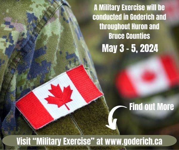The Canadian Armed Forces will be conducting an emergency exercise in Huron and Bruce Counties between Friday, May 3 and Sunday, May 5, 2024. Goderich residents will notice a military presence throughout Town as soldiers will be stationed in the community over the weekend.