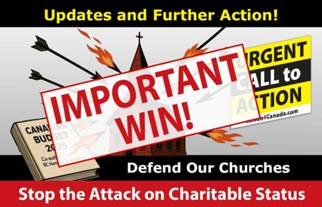 What an incredible testament to the power of united faith and unwavering resolve! Thanks to your tireless advocacy—your emails, calls, shares, and prayers—we’ve secured a monumental win in the fight to defend the charitable status of our churches and faith-based organizations. Recommendations 429 and 430 from the December 2024 Finance Committee report, which threatened to strip away this vital protection and force non-compliant churches to surrender their assets, have been officially rejected and removed from consideration in the federal budget process.