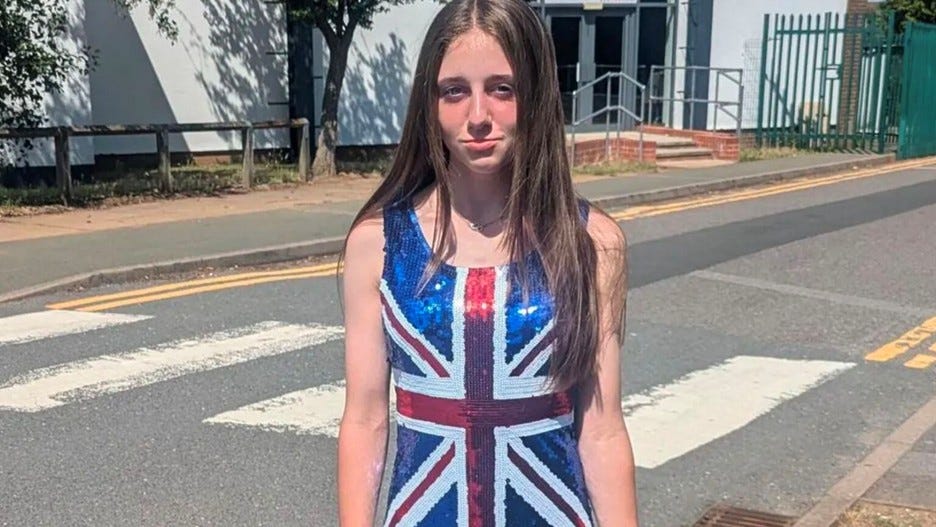 Courtney Wright was told that her dress – featuring a sequinned Union Jack – was ‘unacceptable’. She was placed in ‘isolation’ and given a choice: she could wait for her parents to collect her and take her home, or she could put on a school uniform and return to school. She was effectively treated as if she’d arrived in an SS uniform.